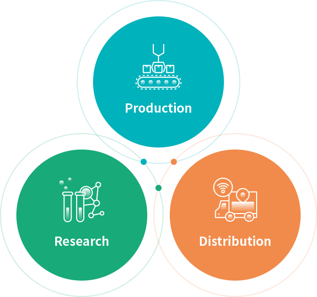 With our own research institute and manufacturing facilities certified by GMP, HACCP, HALAL, and US FDA, we provide a one-stop service from research to production and distribution of raw materials and finished products